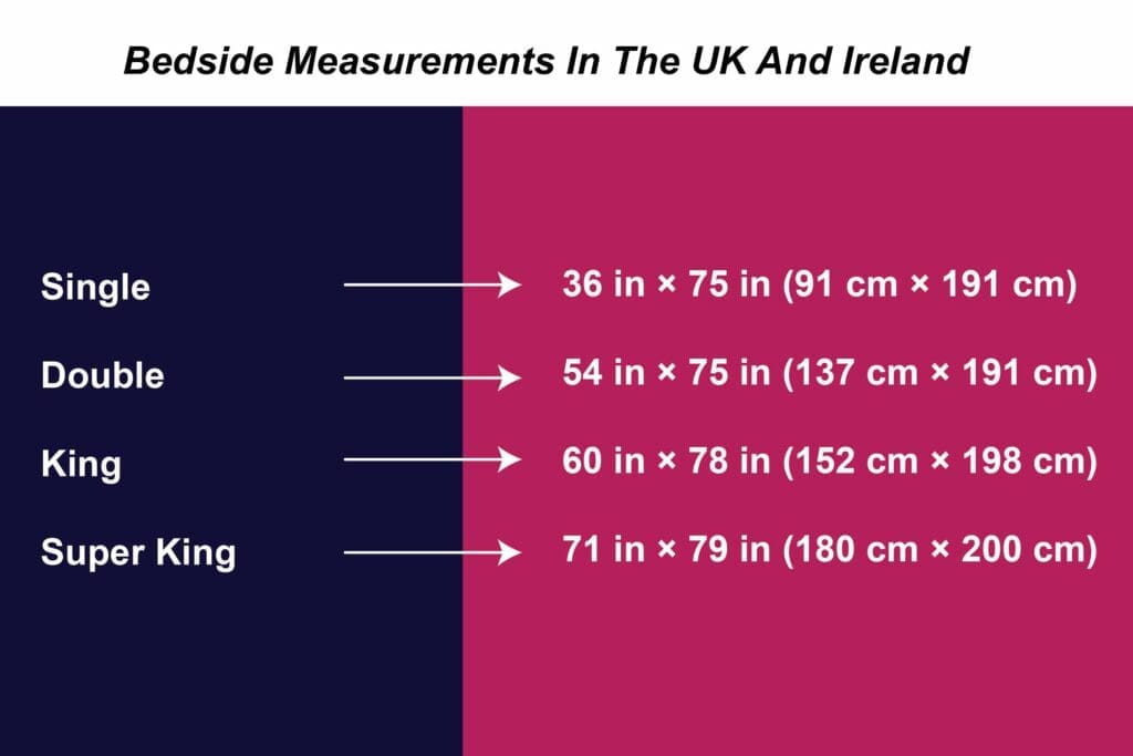 The UK and Ireland have standard bedside measurements, generally smaller than the US. The dimensions are as follows: